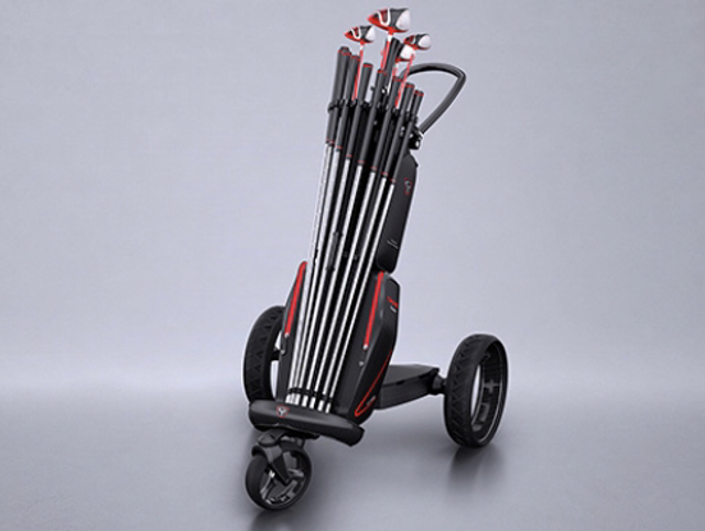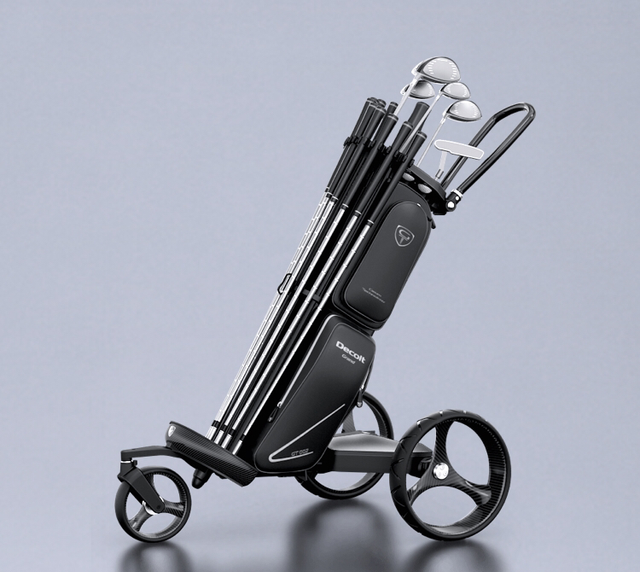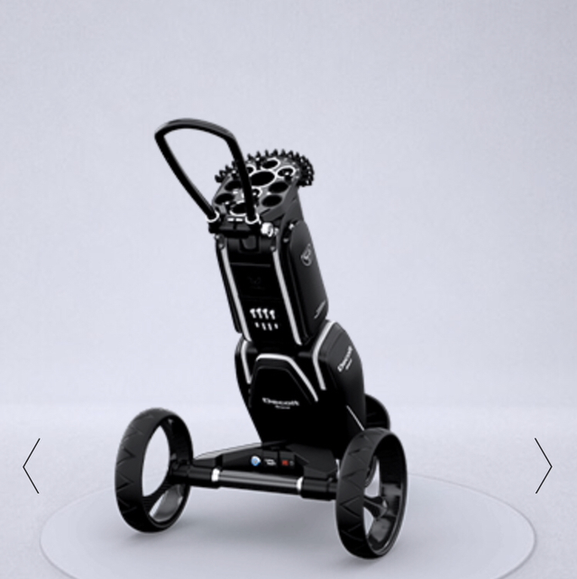 This golf trolley includes a bag, a remote control, and an umbrella. You can also purchase bigger pockets separately. The trolley transforms into: an electric trolley, a three-wheel manual trolley, and a two-wheel manual trolley. The trolley is made of carbon fiber, which is produced by Porsche. The material used for the wheels are produced by adidas.
